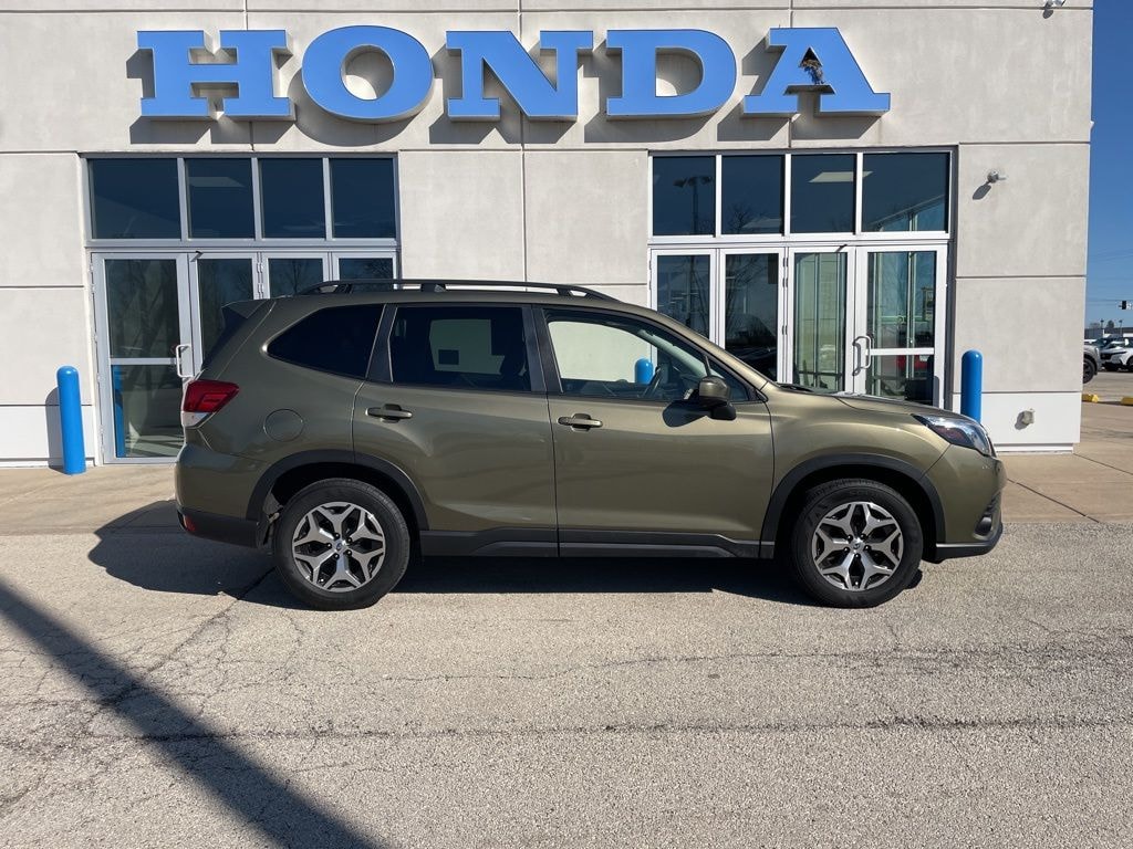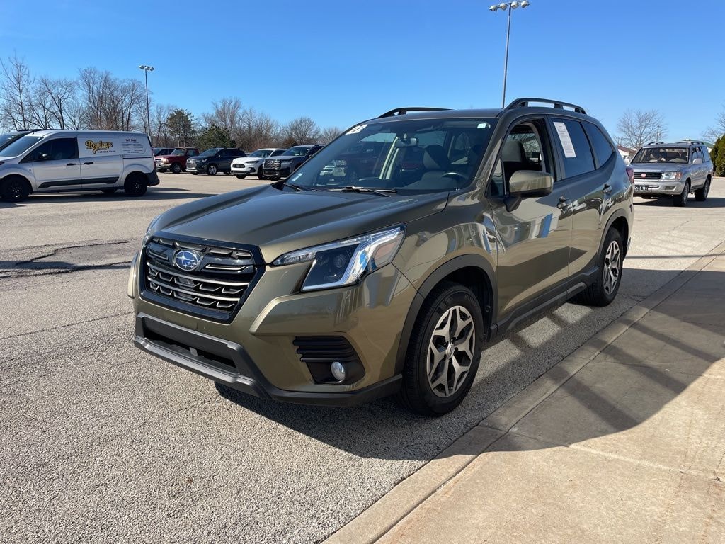 Autumn Green Metallic 2022 Subaru Forester Premium 2.5L 4-Cylinder DOHC 16V AWD This vehicle comes well-equipped with these Blind Spot Detection w/RCTA & Power Rear Gate (Blind Spot Detection (BSD), Driver's Seatback Divided Pocket, Dual USB Charge Ports, EyeSight System, Multi-Function High Grade Display, and Power Rear Gate), 3.70 Axle Ratio, 4-Wheel Disc Brakes, 6 Speakers, ABS brakes, Air Conditioning, Alloy wheels, AM/FM radio: SiriusXM, Anti-whiplash front head restraints, Auto High-beam Headlights, Automatic temperature control, Brake assist, Bumpers: body-color, CD player, Driver door bin, Driver vanity mirror, Dual front impact airbags, Dual front side impact airbags, Electronic Stability Control, Emergency communication system: STARLINK Safety and Security (Subscription Required), Exterior Parking Camera Rear, Four wheel independent suspension, Front anti-roll bar, Front Bucket Seats, Front Center Armrest, Front fog lights, Front reading lights, Fully automatic headlights, Heated door mirrors, Heated Front Bucket Seats, Heated front seats, Illuminated entry, Knee airbag, Low tire pressure warning, Occupant sensing airbag, Outside temperature display, Overhead airbag, Overhead console, Panic alarm, Passenger door bin, Passenger vanity mirror, Power door mirrors, Power driver seat, Power moonroof: Panoramic, Power steering, Power windows, Premium Cloth Upholstery, Radio data system, Radio: Subaru Starlink 6.5" Multimedia Plus System, Rear anti-roll bar, Rear seat center armrest, Rear window defroster, Rear window wiper, Remote keyless entry, Roof rack: rails only, Security system, Speed control, Speed-sensing steering, Split folding rear seat, Spoiler, STARLINK/Apple CarPlay/Android Auto, Steering wheel mounted audio controls, Tachometer, Telescoping steering wheel, Tilt steering wheel, Traction control, Trip computer, Variably intermittent wipers, and Wheels: 17" x 7.0J Black Machine Finish Alloy.